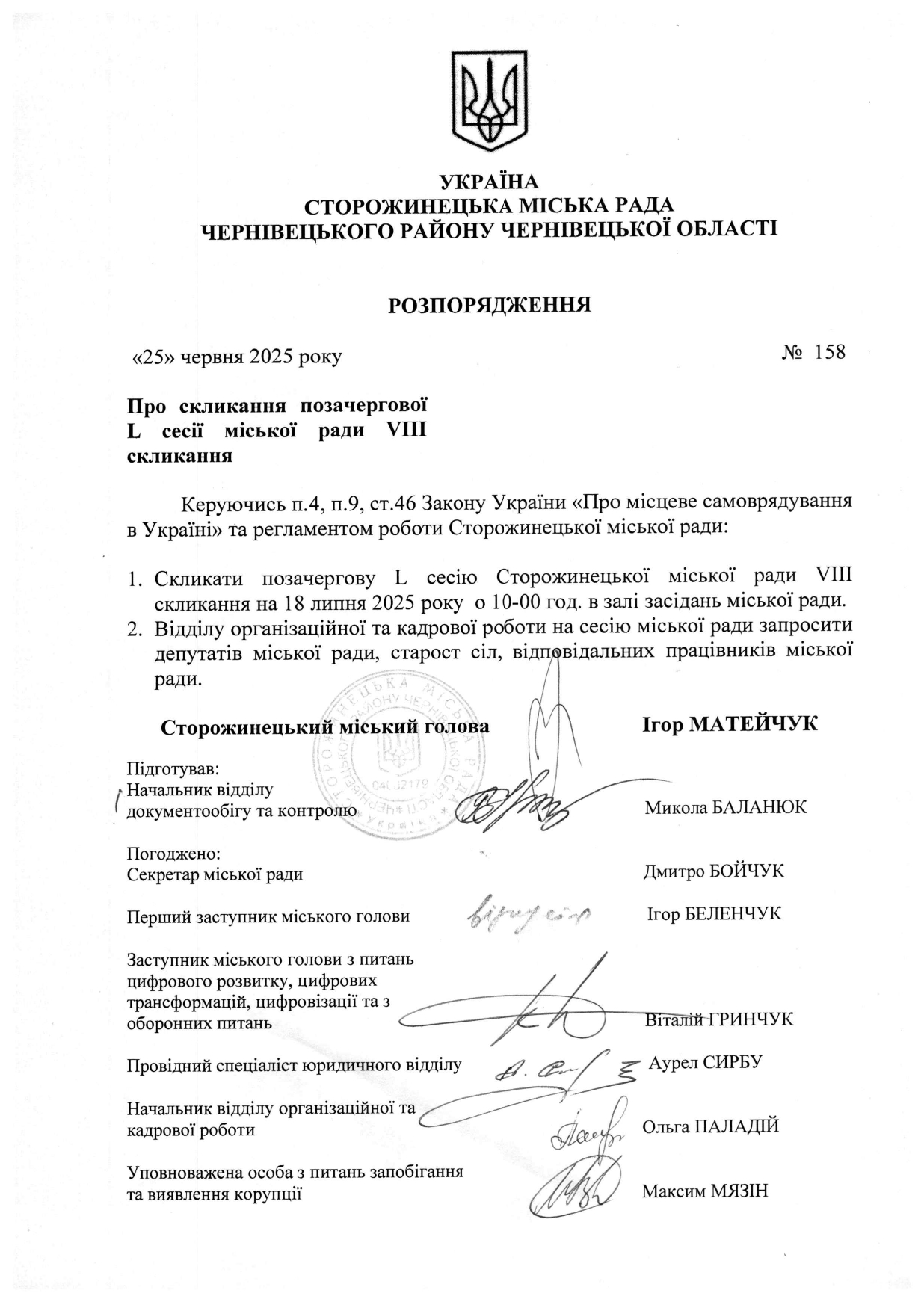 Розпорядження про скликання позачергової L сесії міської ради VIII скликання Навігація записів РІШЕННЯ ПОЗАЧЕРГОВОГО ЗАСІДАННЯ ВИКОНАВЧОГО КОМІТЕТУ ВІД 17.06.2025 РОКУ ІНФОРМУВАННЯ споживачів про намір встановлення тарифів на послуги з централізованого водопостачання