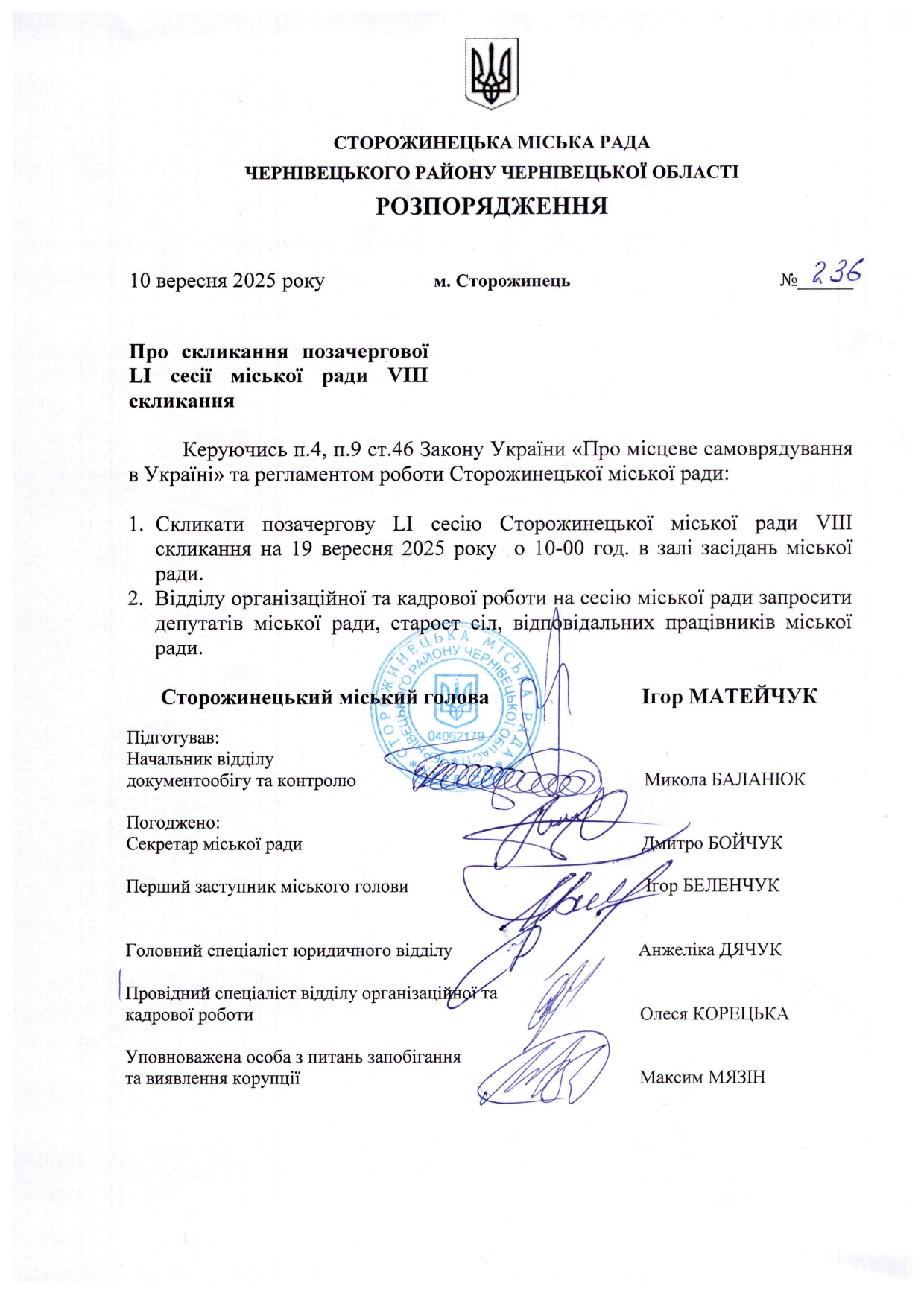Розпорядження про скликання позачергової LI сесії міської ради VIII скликання Навігація записів Про затвердження паспортів бюджетних програм міського бюджету на 2025 рік зі змінами Протокол засідання постійної комісії з питань регулювання земельних відносин, архітектури, будівництва та перспективного планування від 15.09.2025 року