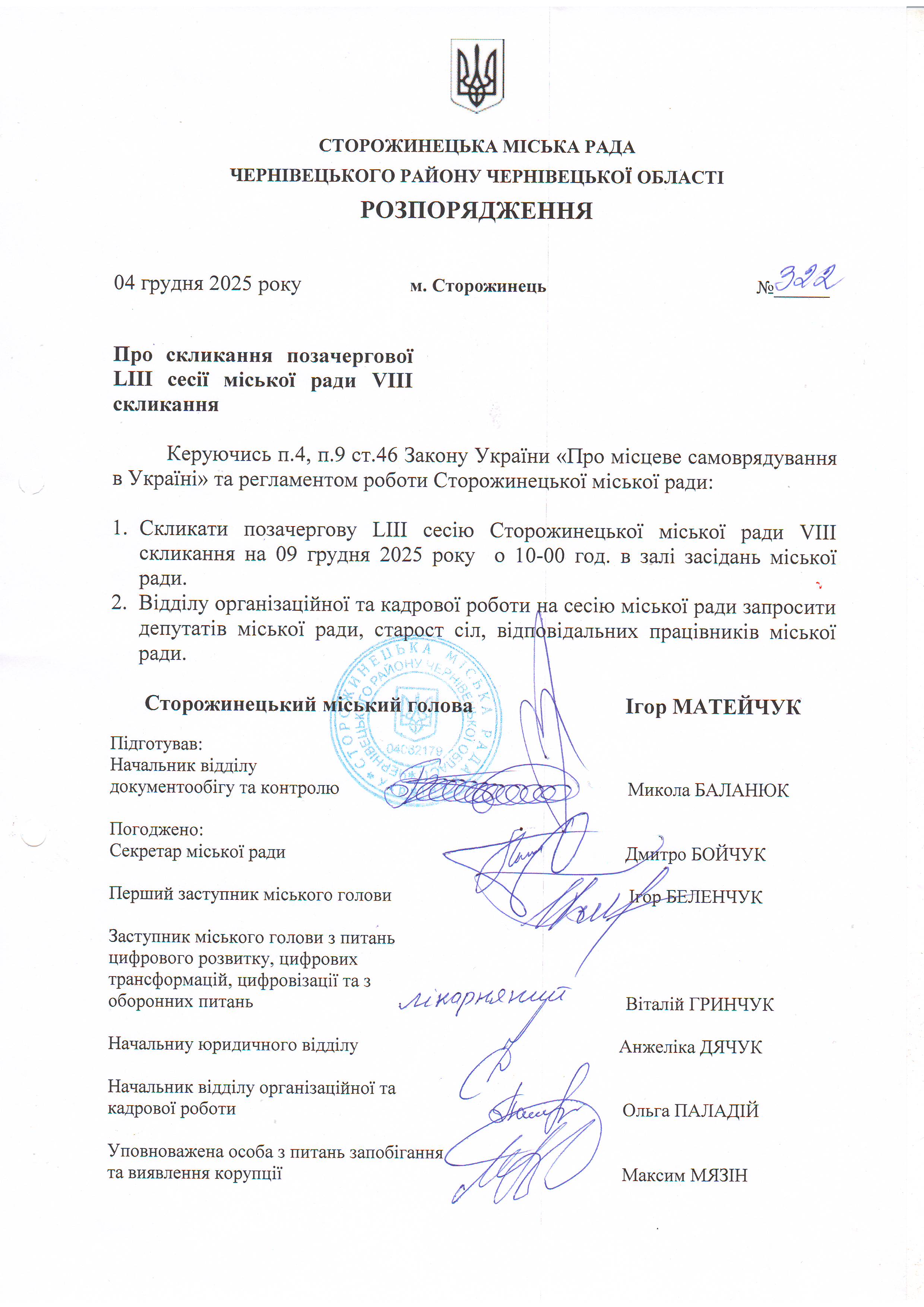 Розпорядження про скликання позачергової LІІІ сесії міської ради VIII скликання Навігація записів Звіт щодо задоволення запитів на інформацію за 11 місяців 2025 року Біографічна довідка кандидата у члени виконавчого комітету Сторожинецької міської ради