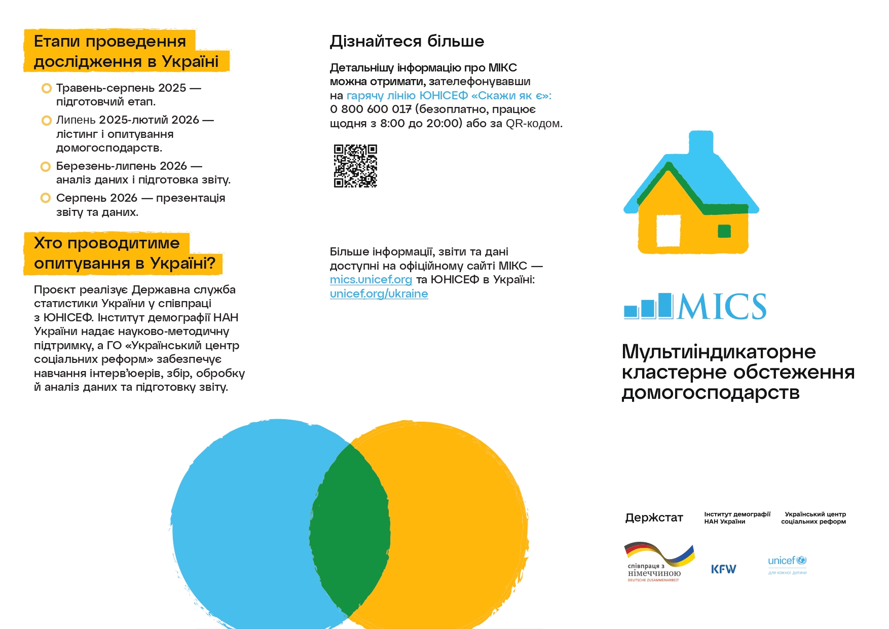 Державна служба статистики України спільно з Інститутом демографії та досліджень якості життя імені М. В. Птухи НАН України та ГО «Український центр соціальних реформ» за підтримки Дитячого фонду ООН (ЮНІСЕФ) в Україні продовжує реалізацію чергового раунду Мультиіндикаторного кластерного обстеження домогосподарств (МІКС) у 2025–2026 роках.