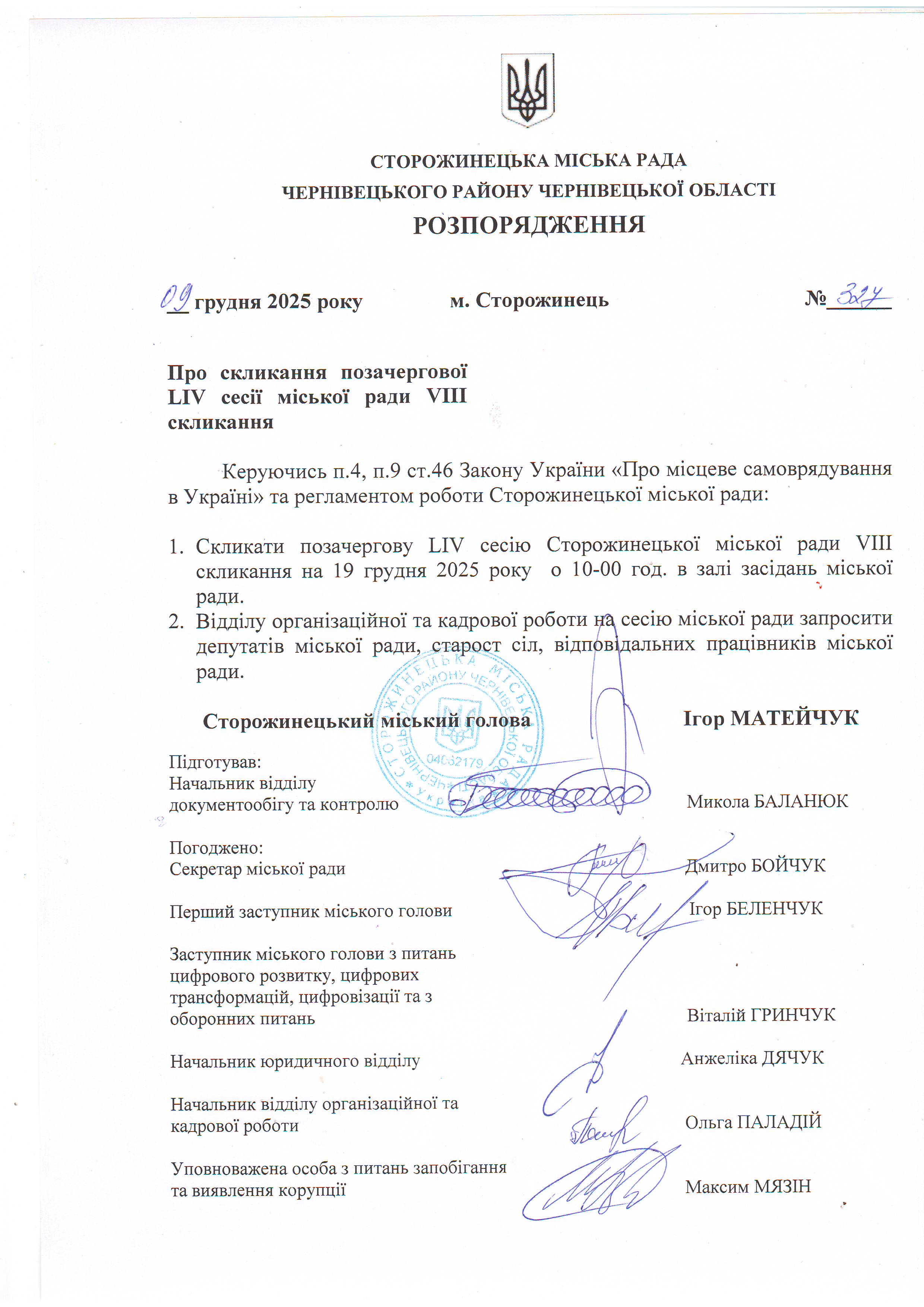 Розпорядження про скликання позачергової LІV сесії міської ради VІІІ скликання