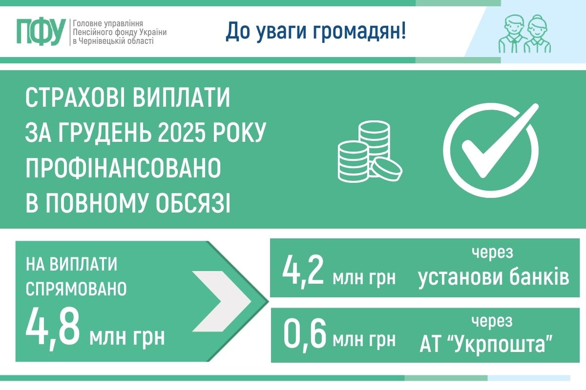 Страхові виплати мешканцям Чернівецької області за грудень 2025 року профінансовано в повному обсязі