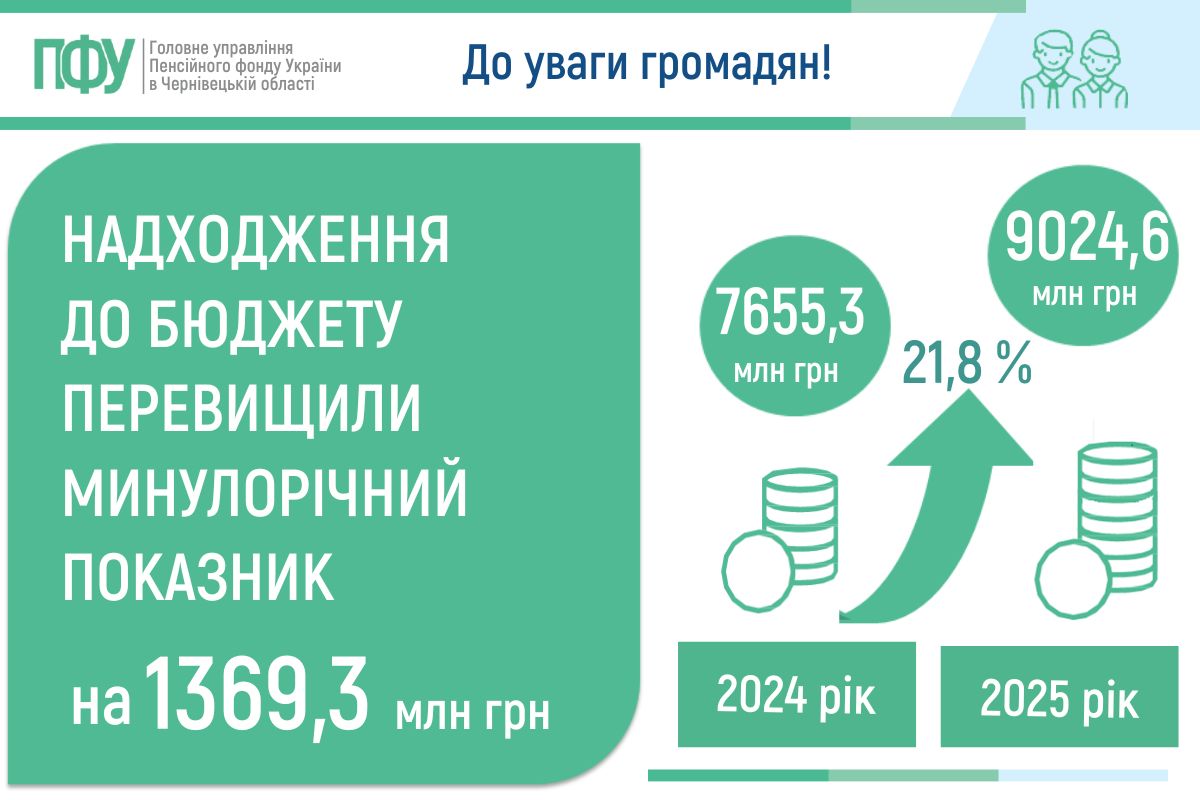 До бюджету Пенсійного фонду України по Чернівецькій області за 2025 рік надійшло на 1369,3 млн грн більше, ніж торік