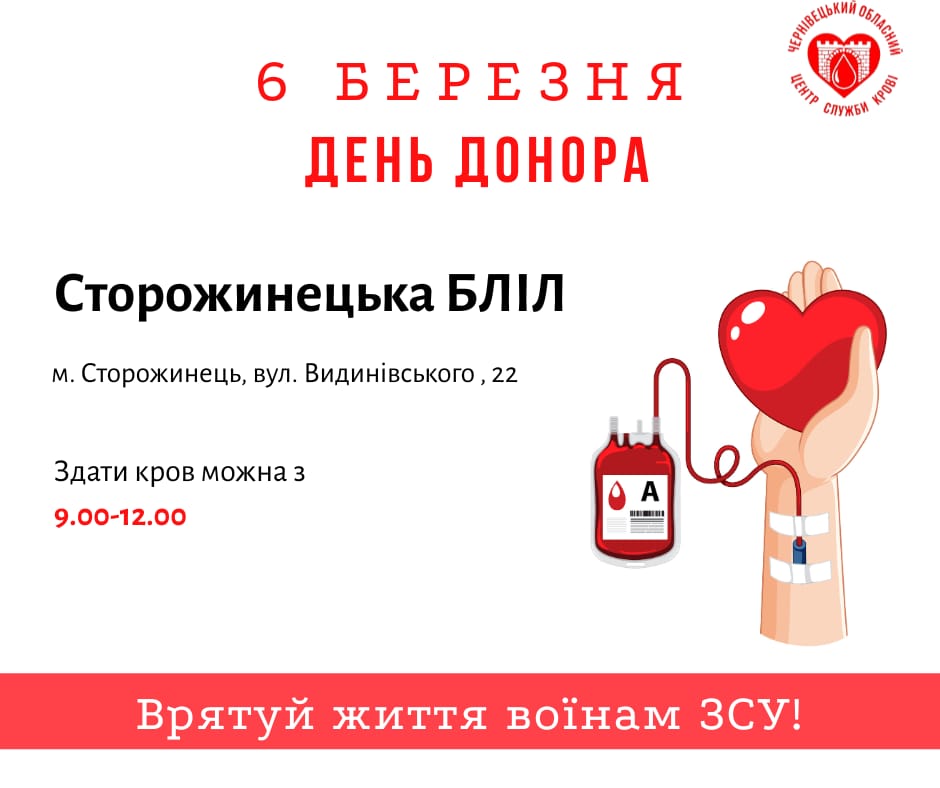 6 березня у КНП Сторожинецька БЛІЛ буде проведено День Донора. Здати кров можна з 9:00 – 12:00 год.