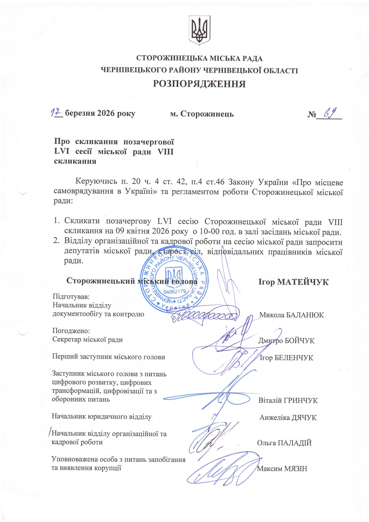 Розпорядження № 69 від 17.03.2026 року Навігація записів РІШЕННЯ ПОЗАЧЕРГОВОГО ЗАСІДАННЯ ВИКОНАВЧОГО КОМІТЕТУ ВІД 06.03.2026 РОКУ ПРОЄКТИ РІШЕНЬ ПОЗАЧЕРГОВОГО ЗАСІДАННЯ ВИКОНАВЧОГО КОМІТЕТУ ВІД 24.03.2026 РОКУ